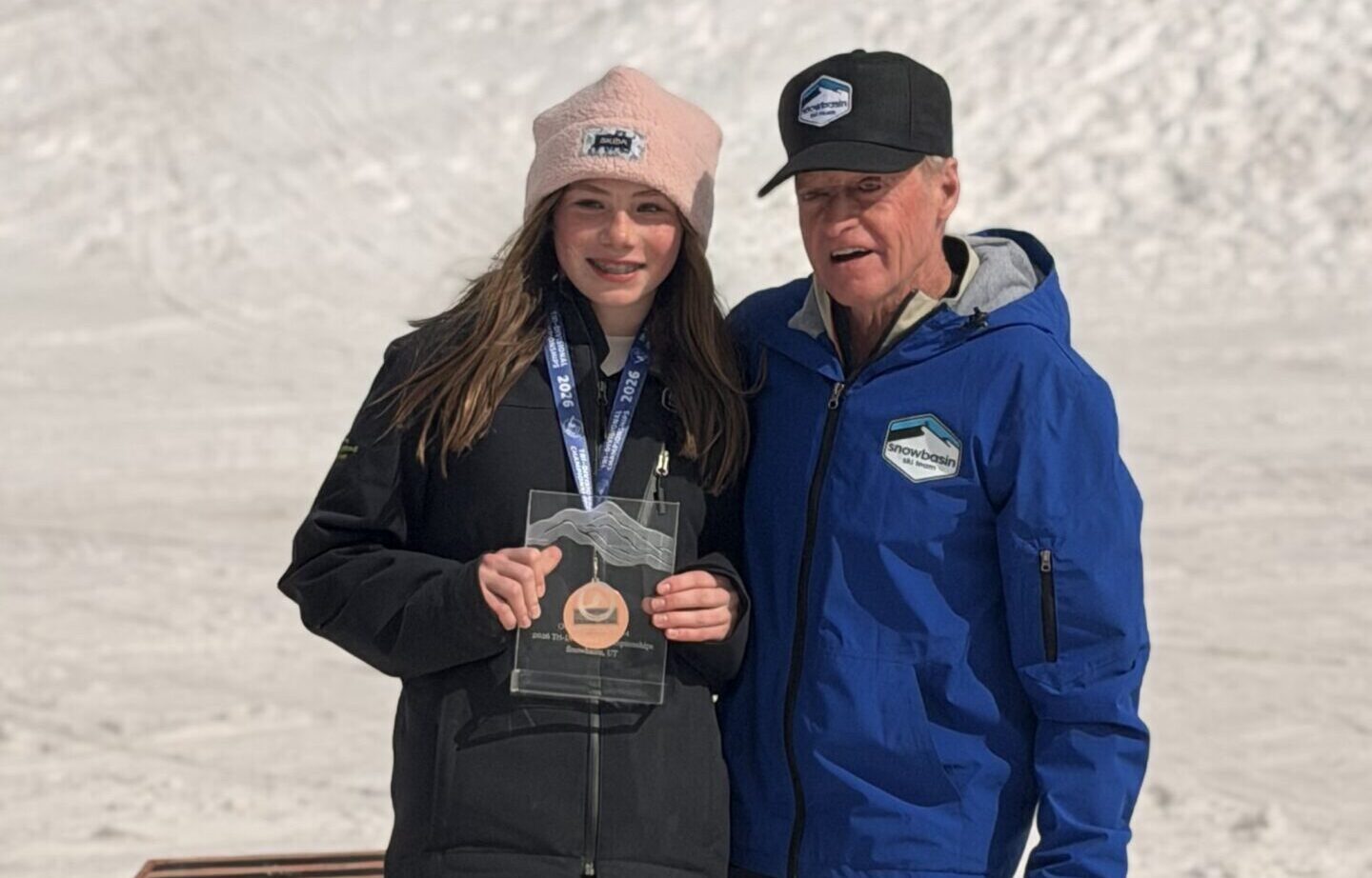 Photo: U14 skier Halley McGrew with the overall series win posing at the podium with legendary skier and coach Scott Hoffman.